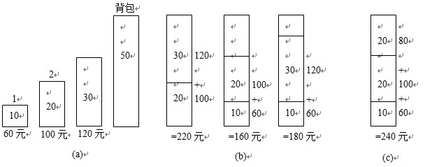 算法knapsack的主要计算时间在于将各种物品依其单位重量的价值从大到小排序。因此,算法的计算时间上界为O(nlogn)。为了证明算法的正确性,还必须证明背包问题具有贪心选择性质。这种贪心选择策略对0-1 背包问题就不适用了。看下图例子,其中有3中物品,背包的容量为50千克。物品1重10千克;价值60元;物品2重20千克;价值100元;物品3重30千克,价值120元。因此,物品1每千克价值6元,物品2每千克价值5元,物品3每千克价值4元。若依贪心选择策略,应首先选择物品1装入背包,然而从图b中各种情况可以看出,最优的选择方案是选择物品2和物品3装入背包。首选物品1的两种方案都不是最优的。对于背包问题,贪心选择最终可得到最优解,其选择方案如图c所示。
