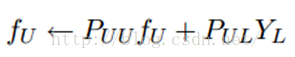 我们知道,我们每次迭代都是计算一个soft label矩阵F=[YL;YU],但是YL是已知的,计算它没有什么用,在步骤2)的时候,还得把它弄回来。我们关心的只是YU,那我们能不能只计算YU呢?Yes。我们将矩阵P做以下划分: