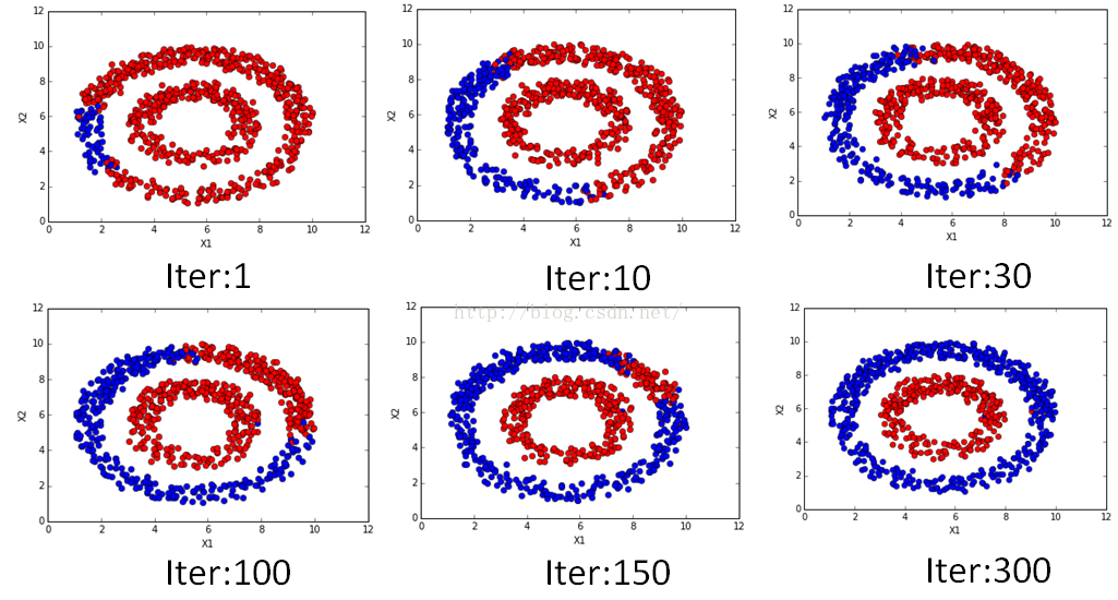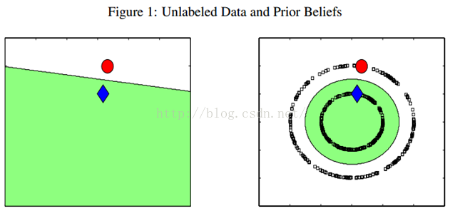 例如下图,只有两个labeled数据,如果直接用他们来训练一个分类器,例如LR或者SVM,那么学出来的分类面就是左图那样的。如果现实中,这个数据是右图那边分布的话,猪都看得出来,左图训练的这个分类器烂的一塌糊涂、惨不忍睹。因为我们的labeled训练数据太少了,都没办法覆盖我们未来可能遇到的情况。但是,如果右图那样,把大量的unlabeled数据(黑色的)都考虑进来,有个全局观念,牛逼的算法会发现,哎哟,原来是两个圈圈(分别处于两个圆形的流形之上)!那算法就很聪明,把大圈的数据都归类为红色类别,把内圈的数据都归类为蓝色类别。因为,实践中,labeled数据是昂贵,很难获得的,但unlabeled数据就不是了,写个脚本在网上爬就可以了,因此如果能充分利用大量的unlabeled数据来辅助提升我们的模型学习,这个价值就非常大。