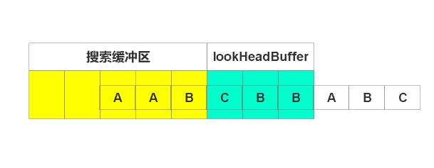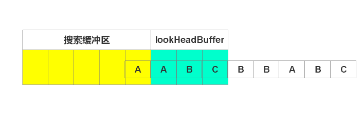 开始编码”A”,在搜索缓冲区查找到匹配字符串。由于待编码缓冲区没有超过,继续编码。开始编码”AB”,也搜索到。不要停止,继续编码“ABC”,找到匹配字符串。由于继续编码,则超过了窗口,故只编码“ABC”,输出(5, 3),偏移5,长度3。右移3个单位,如下图