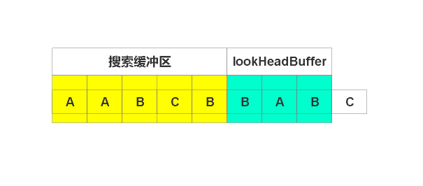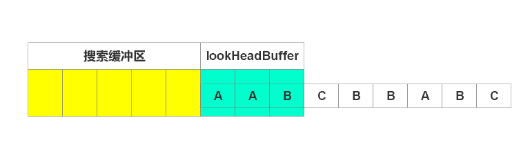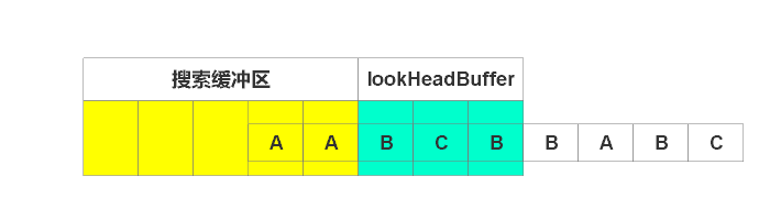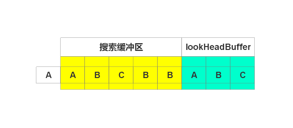 此时待编码区有“ABC”。开始编码。最先编码”A”,在搜索区找到”A”。由于没有超过待编码区,故开始编码”AB”,但在搜索区没有找到匹配字符串,故无法编码。因此只能编码”A”。
