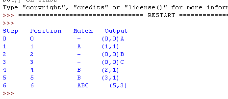 result = (step, self.windSpiltIndex, self.inputStr[self.windSpiltIndex - offset: self.windSpiltIndex - offset + matchLen], '(' + str(offset) + ',' + str(matchLen) + ')') #4.输出结果