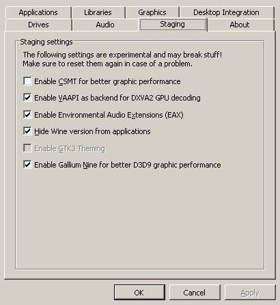 打开 winecfg。确保第一个标签页中的 Windows 版本已经设置成了 Windows 7。 暴雪不再对之前的版本提供支持。 然后进入 “Staging” 标签页。 这里根据你用的是 staging 版本的 Wine 还是打了 Gallium 补丁的 Wine 来进行选择。