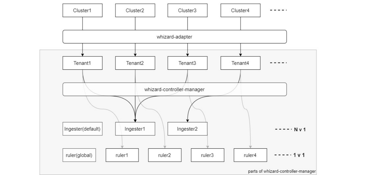 - 每个 KubeSphere Cluster 都会由 whizard-adapter 映射为 Whizard Tenant