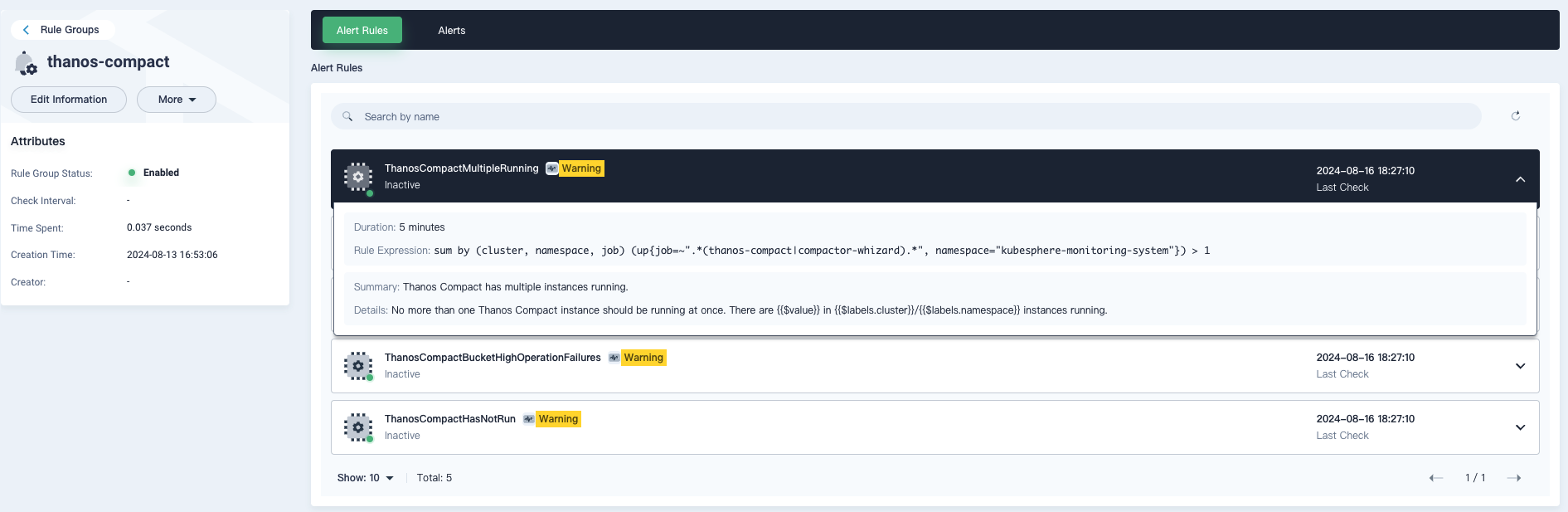 如上图所示是一个全局告警的展示,倒数第二列有一个集群的一列,这个也是通过 Thanos 全局的 Ruler 来计算出来的一个告警。