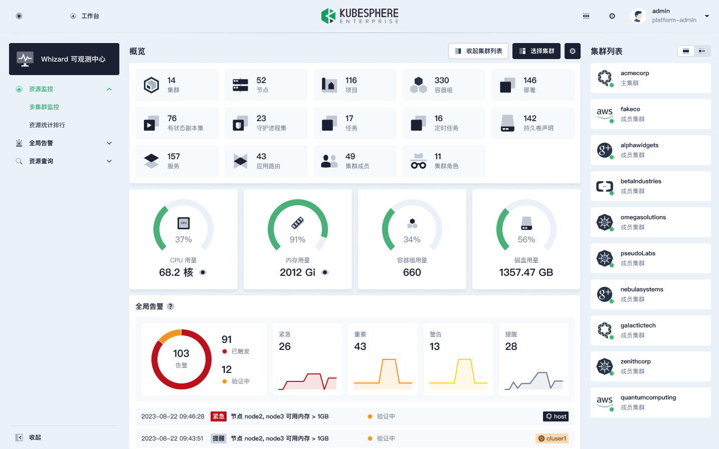 - 提供更多的可观测性功能:事件/日志告警、FinOps 成本管理、报表等