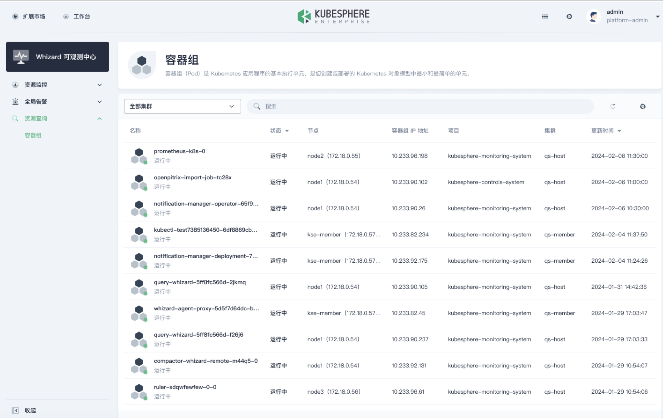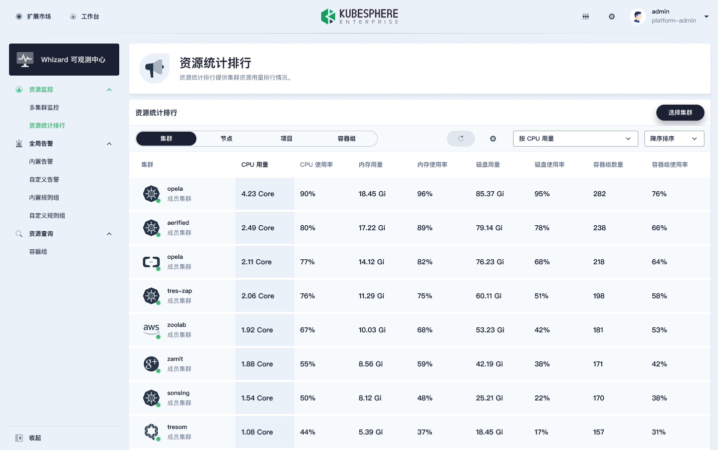 此外,在 Whizard 中,用户还可以跨集群对所有的集群进行资源统计排行,同时还可以看到所有的节点、项目和容器组。这样就比单实例的 Prometheus 多了一个集群的维度。