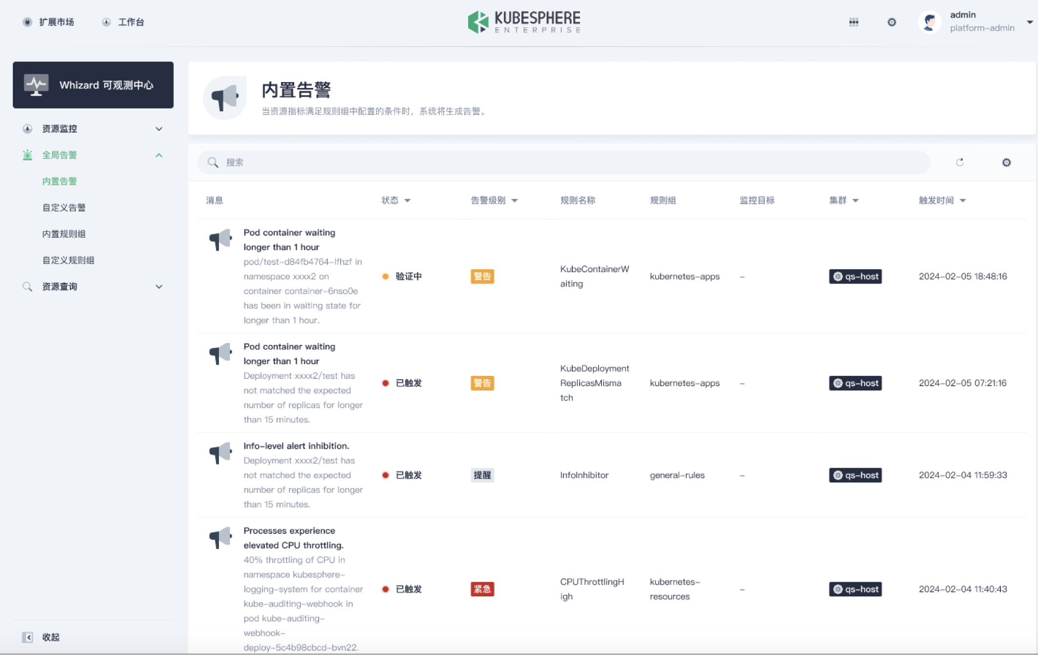 KubeSphere Enterprise v3.x 基于 Whizard 开发的 Whizard 可观测中心将在 KubeSphere Enterprise v4.x 后续版本中演进为 WhizardTelemetry 可观测平台: