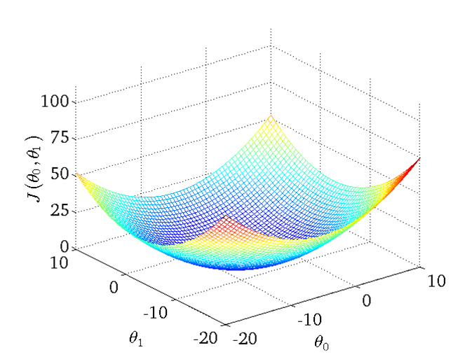 注意:如果是线性回归,则costfunctionJ与的函数一定是碗状的,即只有一个最小点;