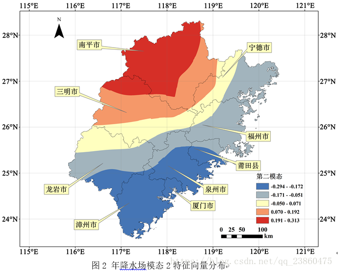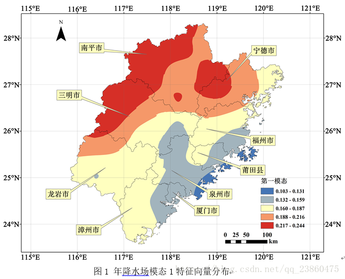 运用Arcgis作模态1和模态2空间分布图(图1、图2)。作图数据如下: