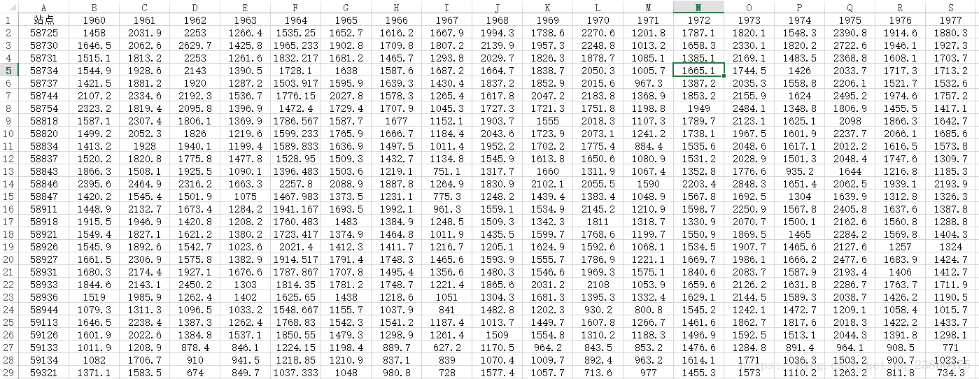 数据集为福建省28个气象站1960-2013年的年际降水量数据,行为站点编号,列为年份时间。部分数据如下: