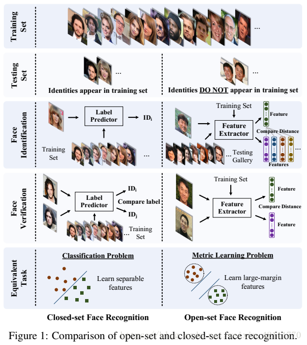 首先,需要先科普一下在训练和测试人脸识别分类器的时候经常被提到的Open-set 和Close-set。Figure 1是一个直观的展示。