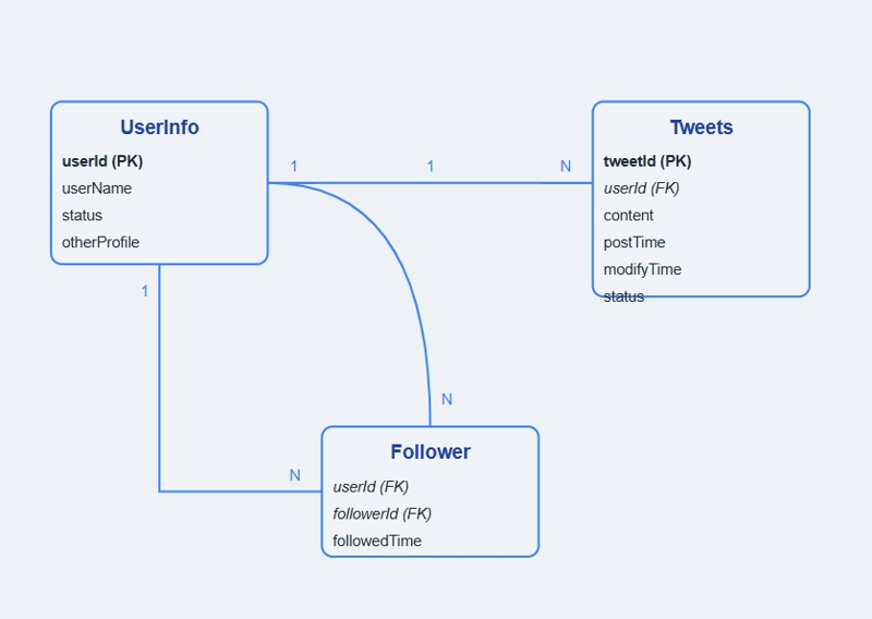 数据库设计包括定义用户、推文和关注关系的表。UserInfo