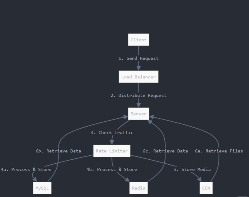 - 对于读取请求,服务器从CDN中获取文件,并从Redis或MySQL中获取数据。
