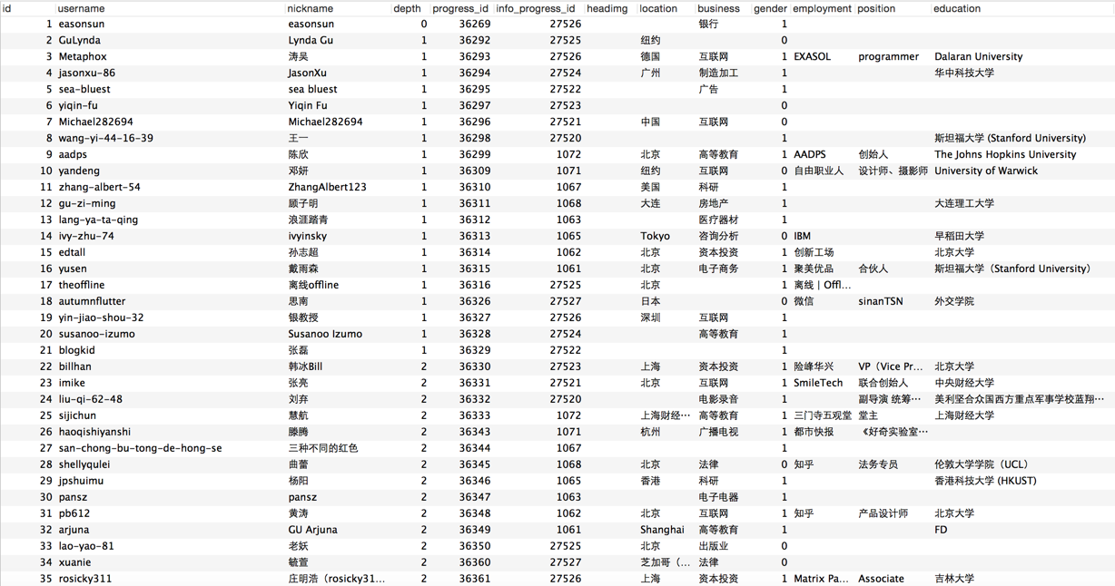 前几天比较火的是一个人用C#写了一个多线程爬虫程序,抓取了QQ空间3000万QQ用户,其中有300万用户是有QQ号、昵称、空间名称等信息的,也就是说,有详情也就300万,跑了两周,这没什么,为了证明PHP是全世界最好的语言,虽然大家都懂的^_^,我用PHP写了一个多进程爬虫程序,只用了一天时间,就抓了知乎100万用户,目前跑到第8圈(depth=8)互相有关联(关注了和关注者)的用户。