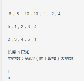 题目:长度为n的数组中,总是存在一个断点(下标记为i),数组中断点前面的数字是有序的,断点后的数字也是有序的,且断点后边的数字总是小于前面的数字。如果直接把断点后边的数字移动到数组的前边,那么这个数组将是有序的,具体描述如下所示。求这个数组中的第n/2大的数。