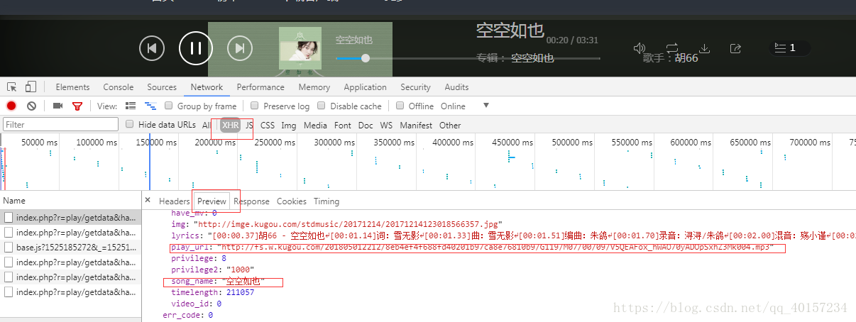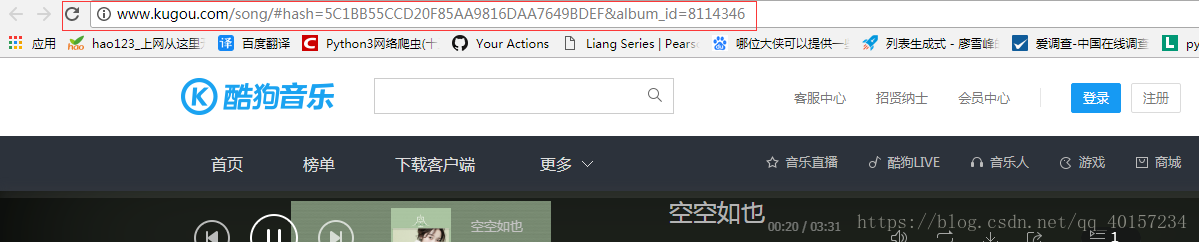 当前页面的url是含有hash参数的,当即想到用 selenium+pantomJs 路线来获取当前页面url,用当前页面的url中的hash参数,来构造请求,获取我们想要的json数据,该数据中包含我们需要的歌曲的具体信息
