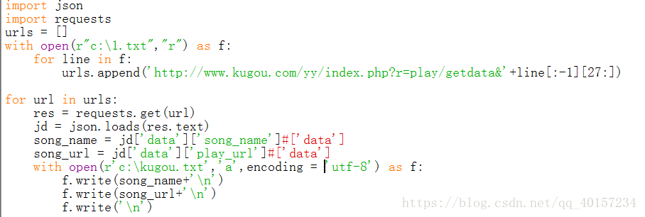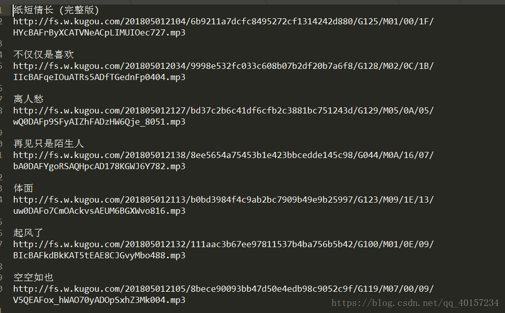 然后对这些url,向酷狗服务器发起访问请求,酷狗将数据都发送给了我们,经过json解析后,我们将结构化的数据保存在kugou.txt中