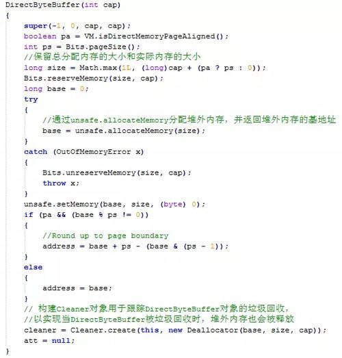 首先,我们来看一下 DirectByteBuffer 源代码,从中洞悉分配堆外内存的过程: