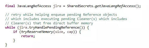 2.如果堆外内存不足,则触发一次非堵塞的 Reference#tryHandlePending(false)。该方法会将已经被 JVM 垃圾回收的 DirectBuffer 对象的堆外内存释放;