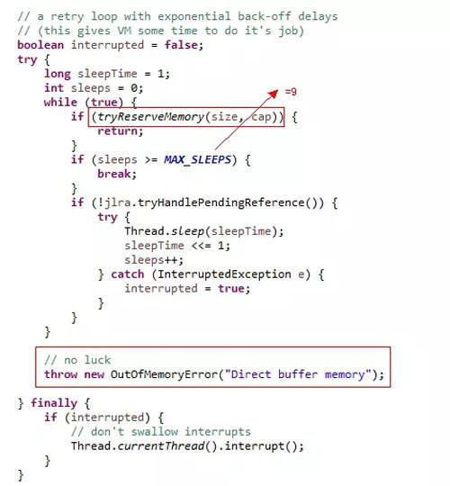 调用 System.gc() 后,接下来会最多进行 9 次循环尝试,仍然通过 tryReserveMemory 方法来判断是否有足够的堆外内存可供分配操作。每次尝试都会 sleep,以便 Full GC 能够完成,如下代码所示。