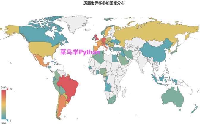 我们首先统计了1930年以来各参赛球队的所属国家及参赛次数,绘制了一张参赛球队所属国家分布图,色调越红 表示参赛次数越多,色调越蓝表示参赛次数越少,空白区域的国家没有球队进入世界杯决赛阶段。