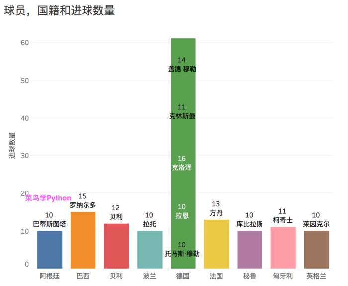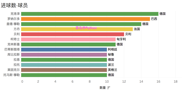 从进球累计数量上看,德国队的数量是最多的,有61球,其次是巴西,看了德国队人才济济啊。