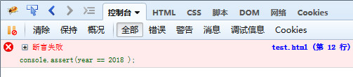 <script type="text/javascript"> var result = 1; console.assert( result ); var year = 2014; console.assert(year == 2018 );</script>