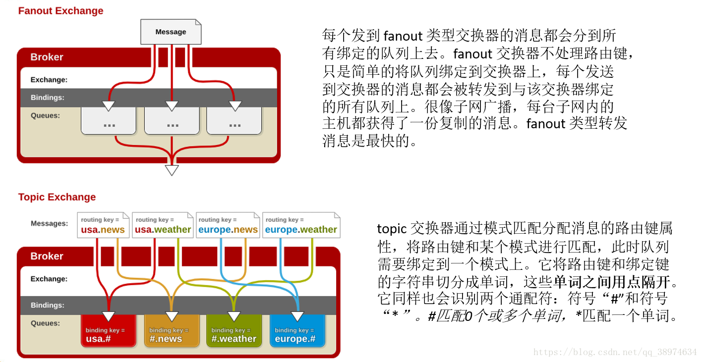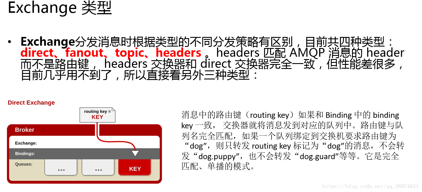 Exchange有4种类型:direct(默认),fanout, topic, 和headers,不同类型的Exchange转发消息的策略有所区别