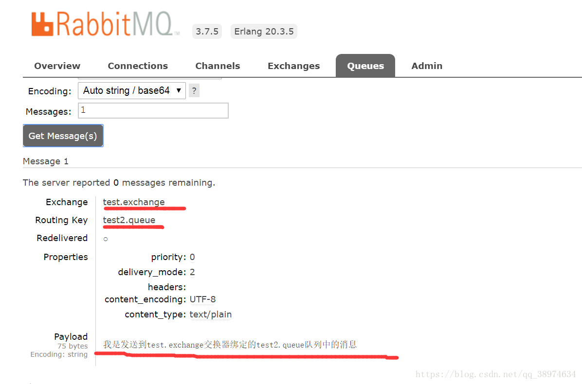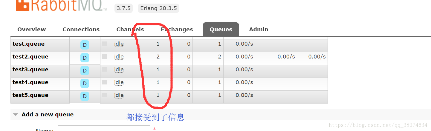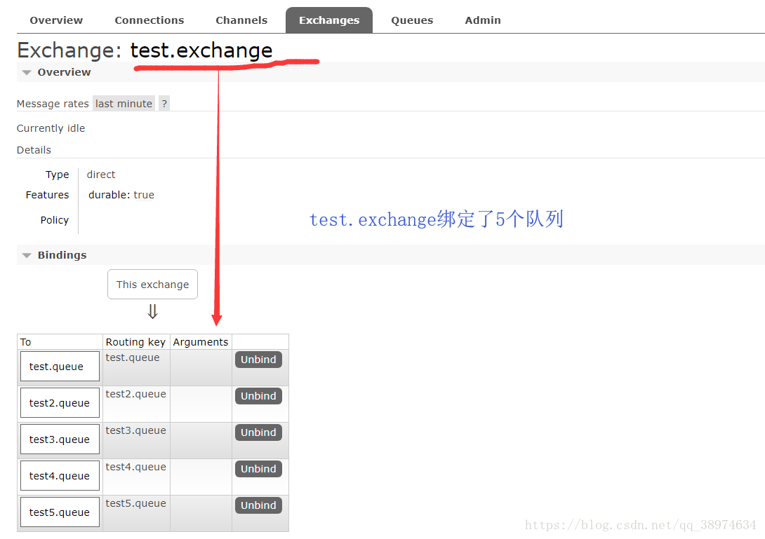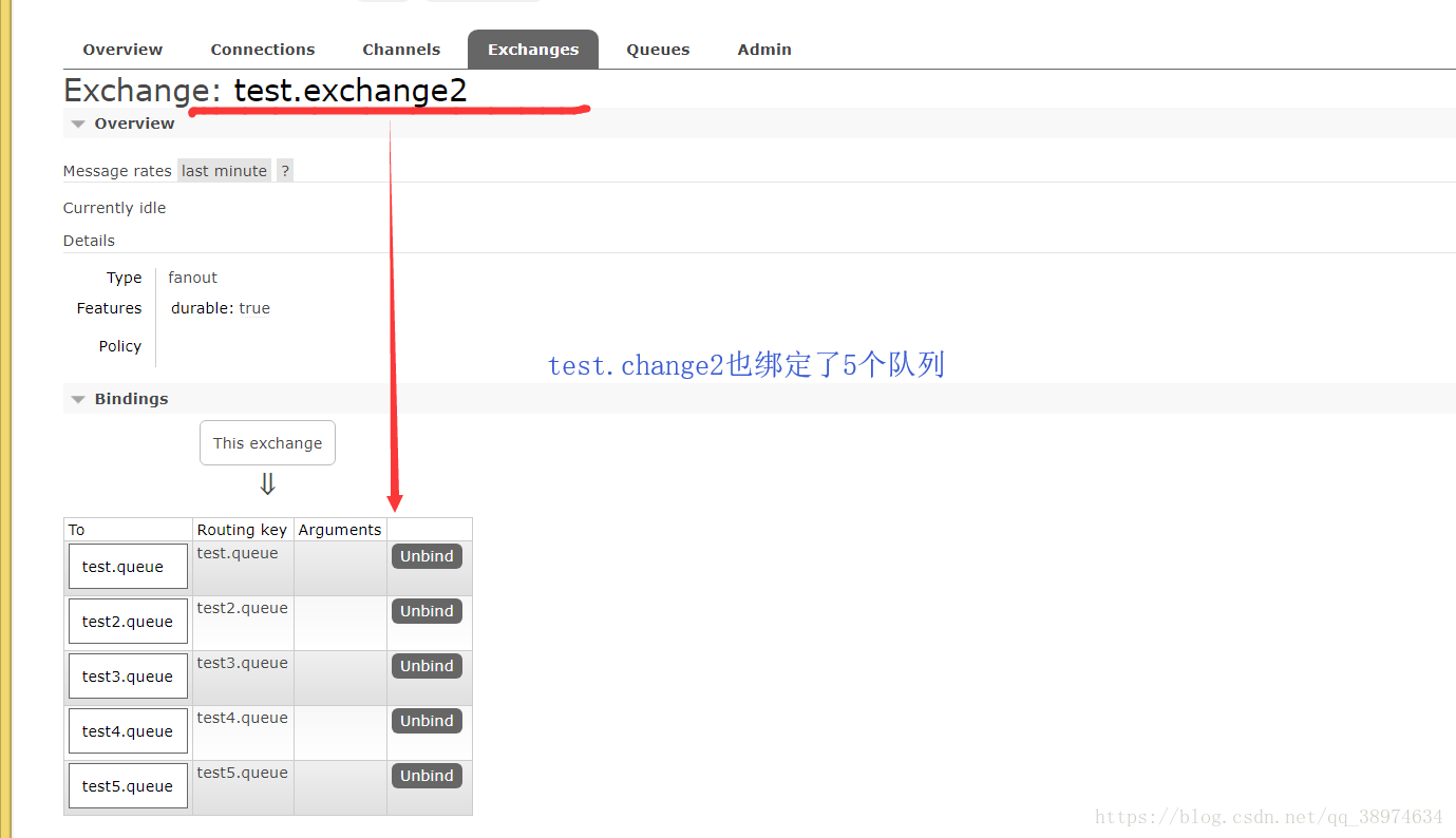 来到管理页面查看,可以看到消息已经成功进入队列了,当然test.exchange是direct所以只能一对一通信