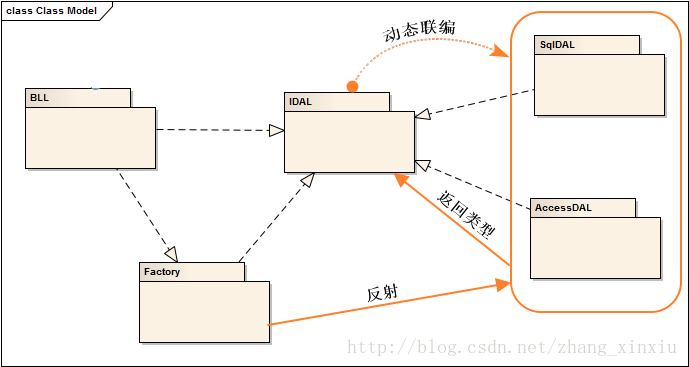 上图中B层在调用接口层实现功能时使用的就是动态联编,对于很多程序员来说它可能是一个新名词,对于不经常思考的程序员来说它必须是一个新名词。B层返回的方法是接口,在执行方法时调用的是接口的方法,但是在实现时调用的却是DAL层中的方法,这就是动态联编的过程。