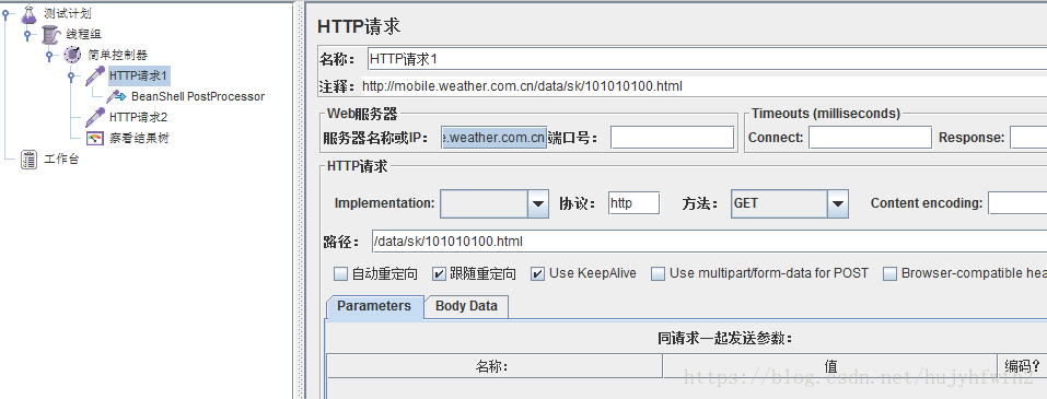 1.1:【线程组】->【简单控制器】->【HTTP sampler】->【Beanshell后置取样器】->【查看结果树】