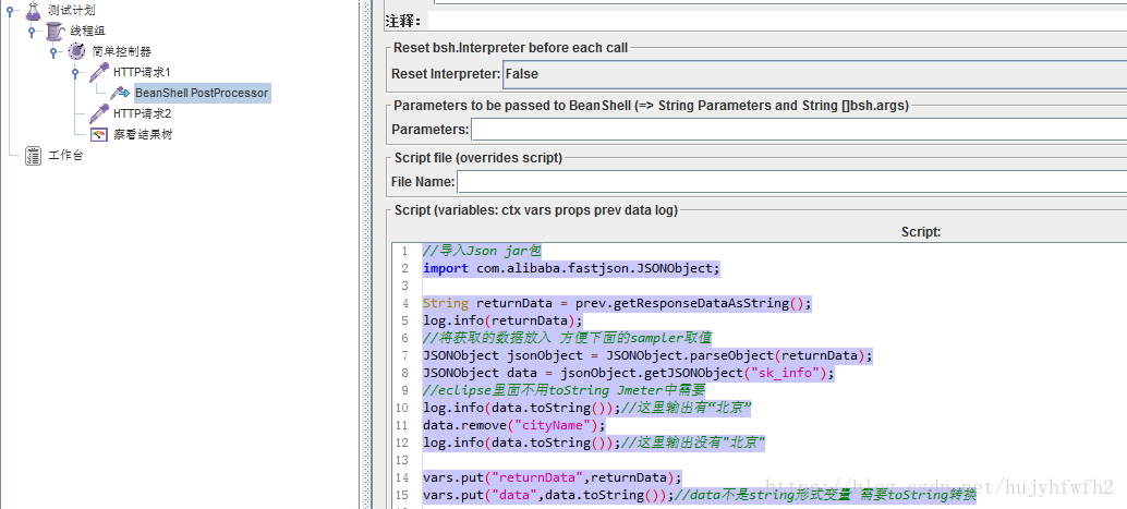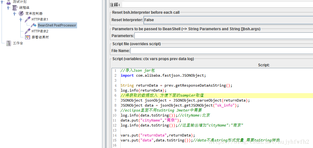 | //导入Json jar包 import com.alibaba.fastjson.JSONObject; String returnData = prev.getResponseDataAsString(); log.info(returnData); //将获取的数据放入 方便下面的sampler取值 JSONObject jsonObject = JSONObject.parseObject(returnData); JSONObject data = jsonObject.getJSONObject("sk_info"); //eclipse里面不用toString Jmeter中需要 log.info(data.toString()); String city = data.get("cityName"); vars.put("returnData",returnData); vars.put("city",city); |