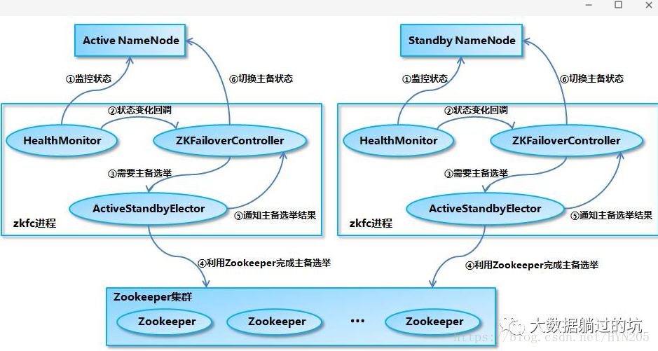 4、ActiveStandbyElector 与 Zookeeper 进行交互完成自动的主备选举。