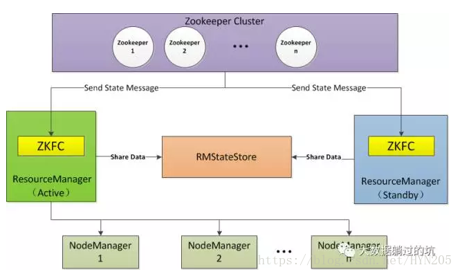 由一对Active,Standby结点构成,通过RMStateStore存储内部数据和主要应用的数据及标记。目前支持的可替代的RMStateStore实现有:基于内存的MemoryRMStateStore,基于文件系统的FileSystemRMStateStore,及基于zookeeper的ZKRMStateStore。 ResourceManager HA的架构模式同NameNode HA的架构模式基本一致,数据共享由RMStateStore,而ZKFC成为 ResourceManager进程的一个服务,非独立存在。