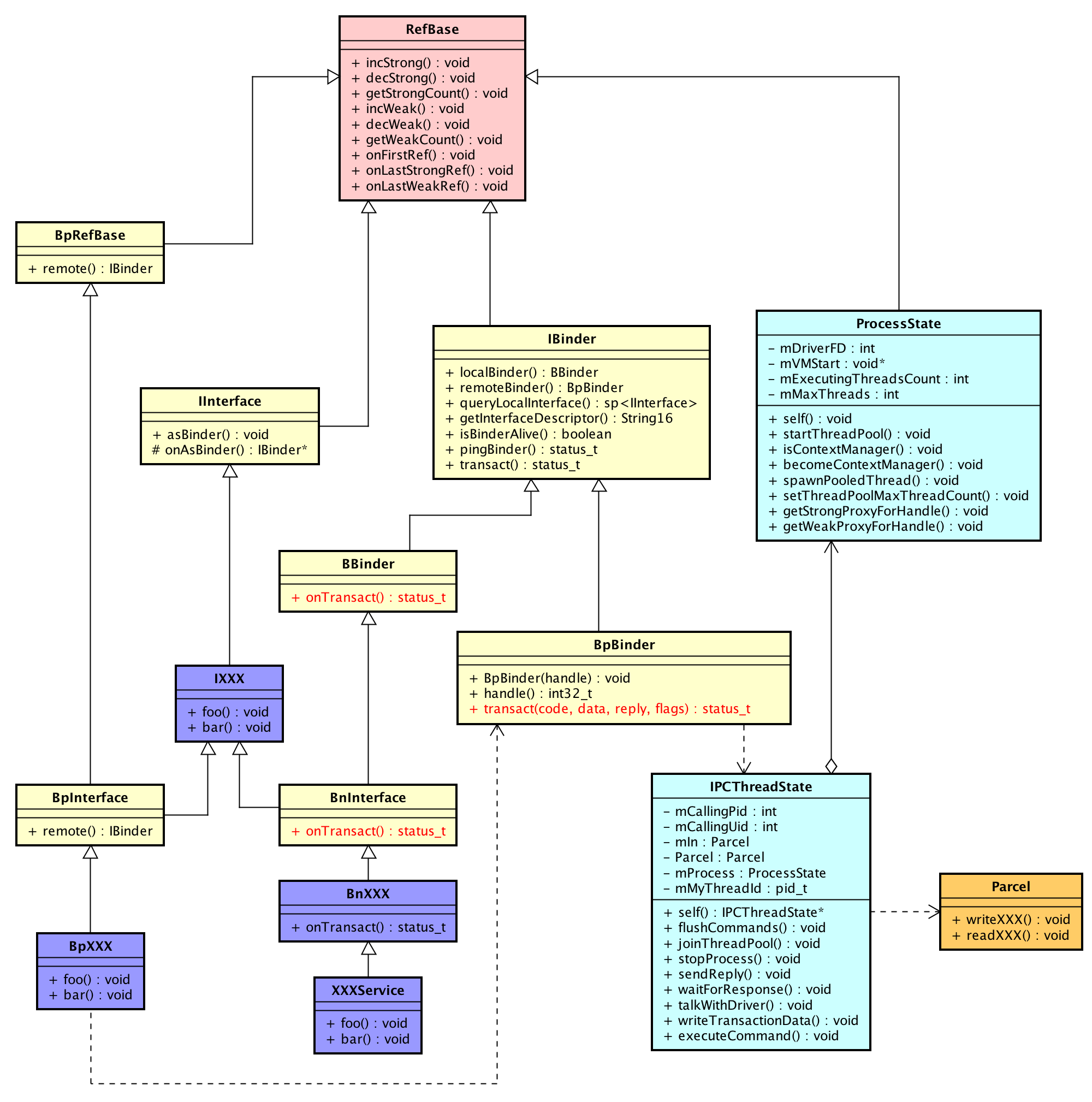这里,我们先对libbinder中的主要类做一个简要说明,了解一下它们的关系,然后再详细的讲解。