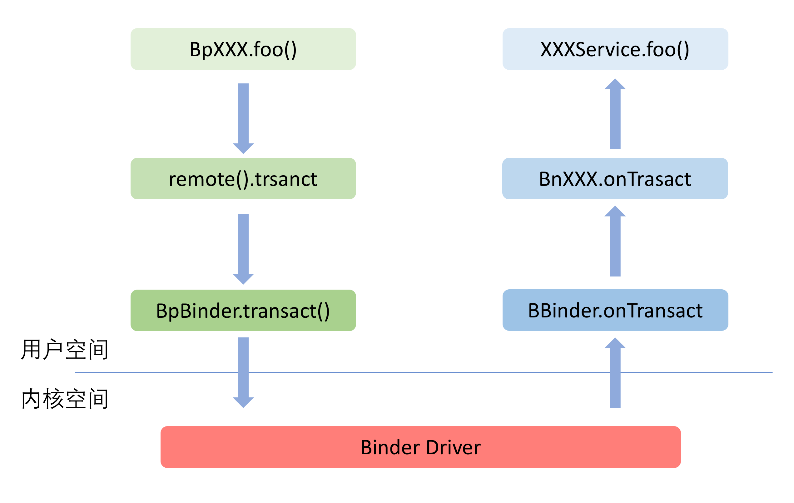 };这两个类都是模板类,它们在继承自INTERFACE的基础上各自继承了另外一个类。这里的INTERFACE便是我们Binder服务接口的基类。另外,BnInterface继承了BBinder类,由此可以通过复写onTransact方法来提供实现。BpInterface继承了BpRefBase,通过这个类的remote方法可以获取到指向服务实现方的句柄。在客户端接口的实现类中,每个接口在组装好参数之后,都会调用remote()->transact来发送请求,而这里其实就是调用的BpBinder的transact方法,这样请求便通过Binder到达了服务实现方的onTransact中。这个过程如下图所示: