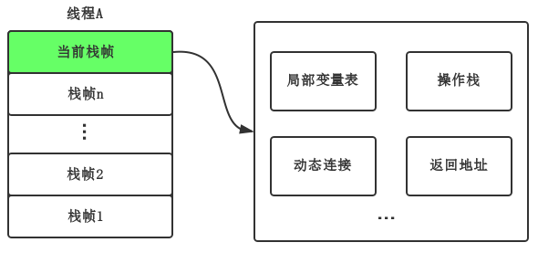 Java栈是线程私有的,每个线程对应一个Java栈,每个线程在执行一个方法时会创建一个对应的栈帧(Stack Frame),栈帧负责存储局部变量变量表、操作数栈、动态链接和方法返回地址等信息。每个方法的调用过程,相当于栈帧在Java栈的入栈和出栈过程。