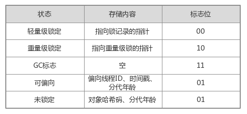 其它状态(轻量级锁定、重量级锁定、GC锁定、可偏向锁)下Mark Word的存储内容如下: