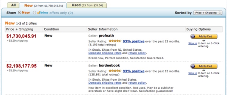 其实这位消费者也不用太过气愤,毕竟亚马逊算法不仅“杀熟”,也“杀商家”:2011年有用户发现亚马逊上有一本天价书,而且有两个商家每天还在竞争性涨价,最终一本书卖到百万美元,放张图大家自行感受一下,