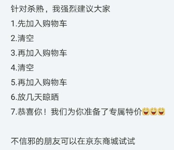 针对大数据“杀熟”,我们也要见招拆招,充分利用平台的机器人检测机制,顺应算法来套取部分优惠。之前脉脉上就有用户爆出,针对京东监控用户的购物车问题,提出了反向破解方式: