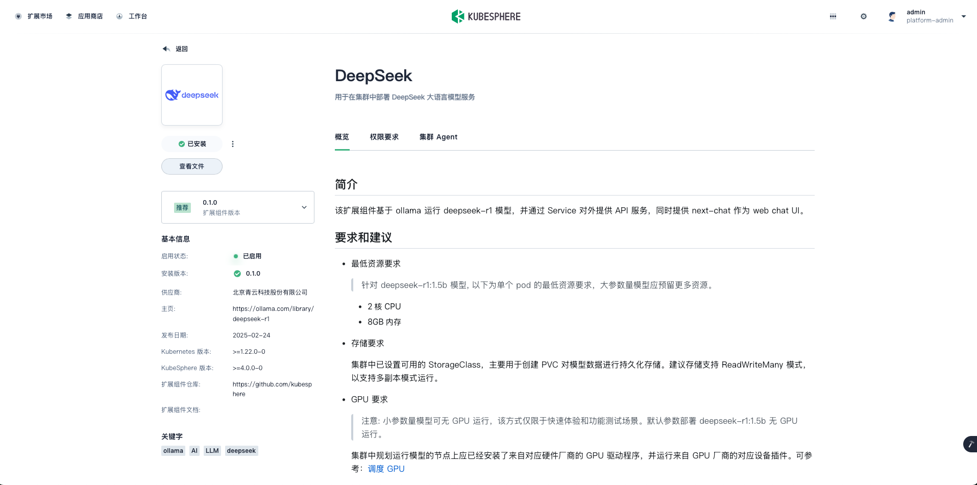 DeepSeek-R1 对中文场景的精准理解,与 KubeSphere 的国产化基因形成天然默契。实测在国产 CPU/GPU 服务器环境下,扩展组件兼容性表现优异,助力企业安全可控落地大模型。