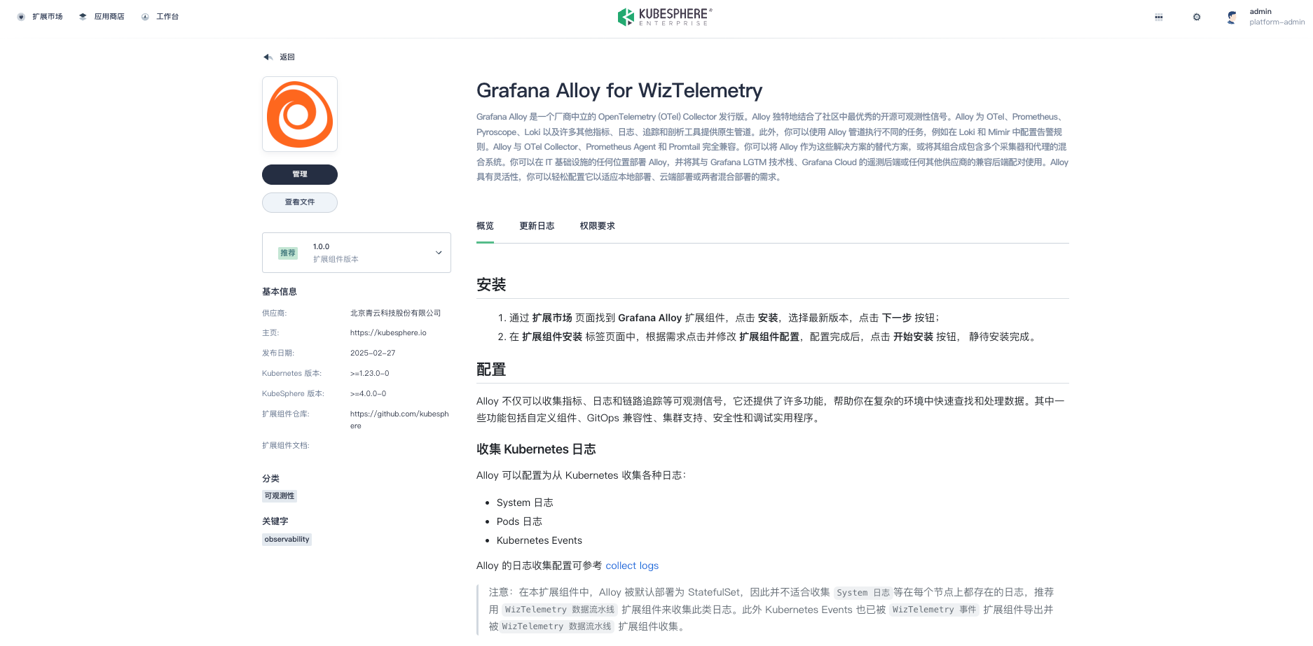 Grafana Alloy 作为新一代高性能、厂商中立的 OpenTelemetry Collector 分发版,支持采集 Kubernetes 日志、Prometheus 指标、OpenTelemetry 链路追踪等多元数据,并内置 MySQL、Kafka、Redis 等 20+ 中间件 Exporter,实现一站式指标抓取与远程写入。结合 KubeSphere 企业版的可观测能力,企业可快速构建覆盖全栈的监控体系,精准定位性能瓶颈。