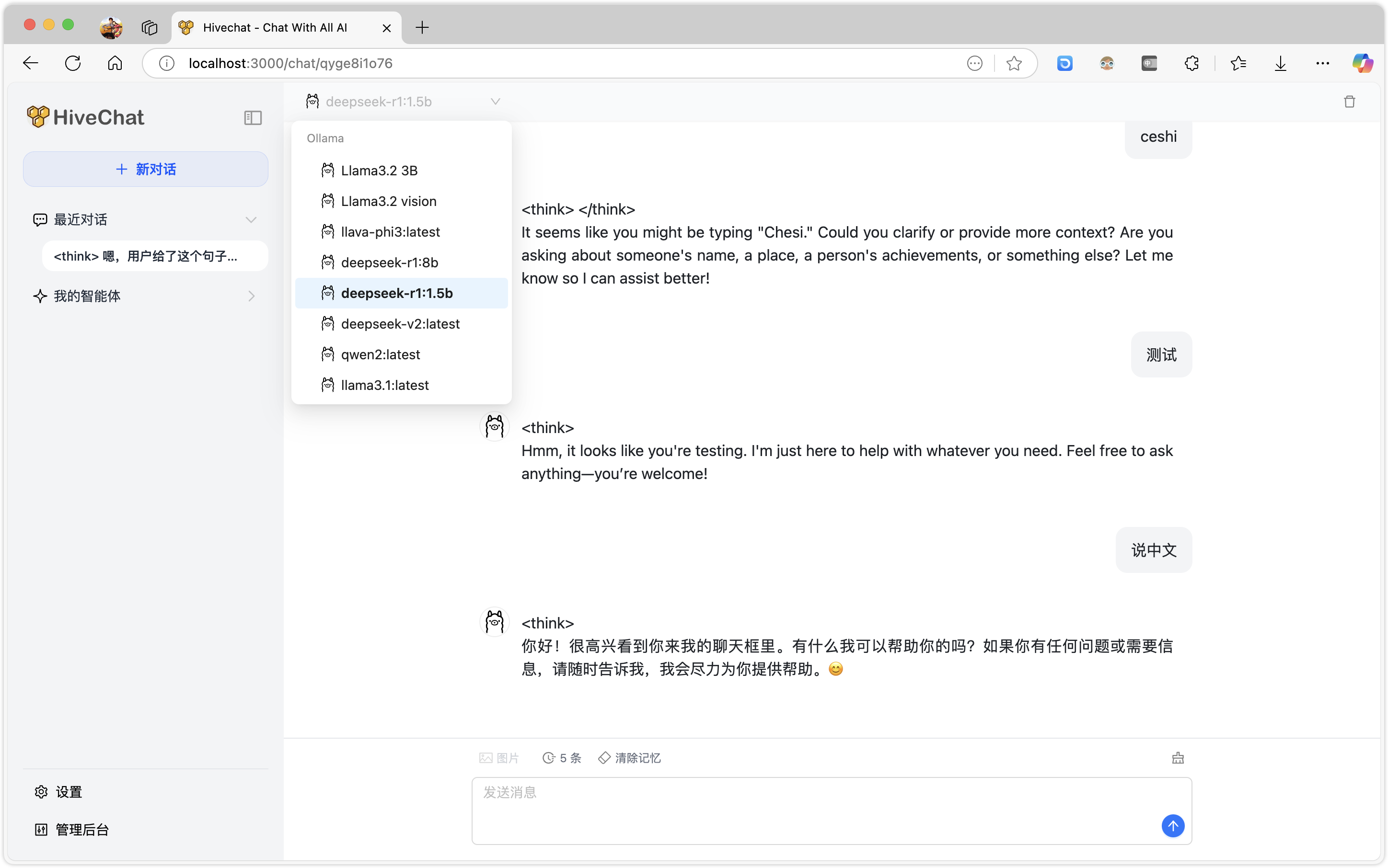 HiveChat 支持多种先进的 AI 模型,如 Deepseek、Open AI、Claude 、ollama 本地和 Gemini 等,能够满足不同团队对于 AI 功能的需求。