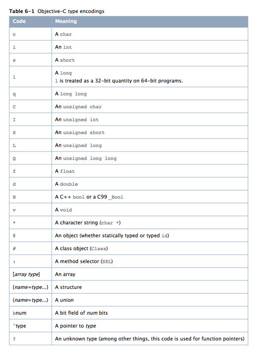 上图中可以看出types的值为v16@0:8,那么这个值代表什么呢?apple为了能够清晰的使用字符串表示方法及其返回值,制定了一系列对应规则,通过下表可以看到一一对应关系