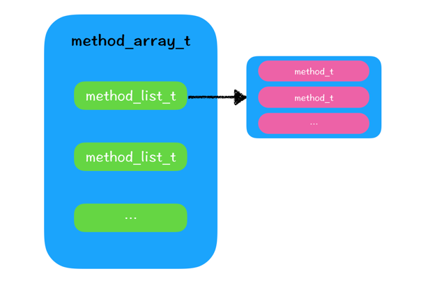 };上述源码中,method_array_t、property_array_t、protocol_array_t其实都是二维数组,来到method_array_t、property_array_t、protocol_array_t内部看一下。这里以method_array_t为例,method_array_t本身就是一个数组,数组里面存放的是数组method_list_t,method_list_t里面最终存放的是method_t