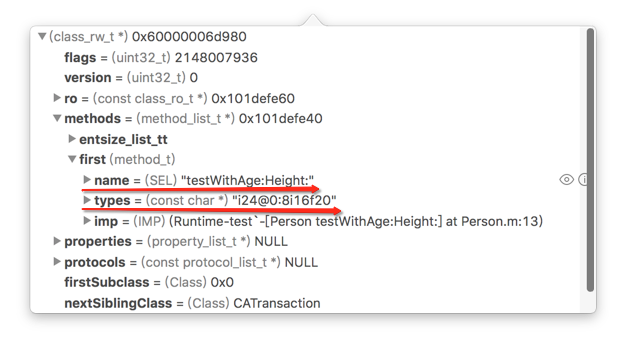 我们知道任何方法都默认有两个参数的,id类型的self,和SEL类型的_cmd,而上述通过对types的分析同时也验证了这个说法。