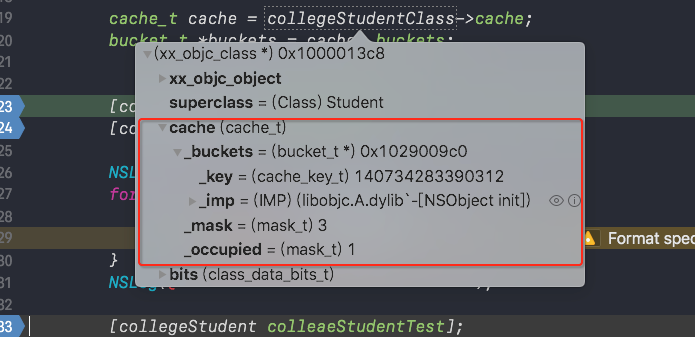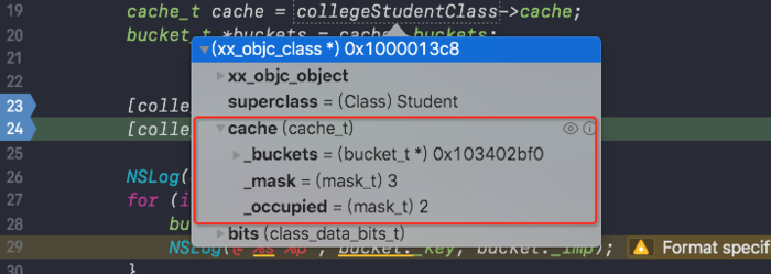 从上图中可以发现,personTest方法调用之前,cache中仅仅存储了init方法,上图中可以看出init方法恰好存储在下标为0的位置因此我们可以看到,_mask的值为3验证我们上述源码中提到的散列表第一次存储时会分配4个内存空间,_occupied的值为1证明此时_buckets中仅仅存储了一个方法。
