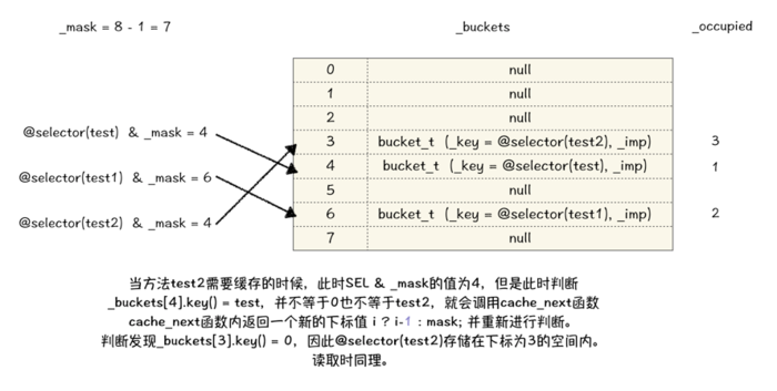 当散列表中存储的方法占据散列表长度超过3/4的时候,散列表会进行扩容操作,将创建一个新的散列表并且空间扩容至原来空间的两倍,并重置_mask的值,最后释放旧的散列表,此时再有方法要进行缓存的话,就需要重新通过SEL & mask计算出下标值之后在按照下标进行存储了。
