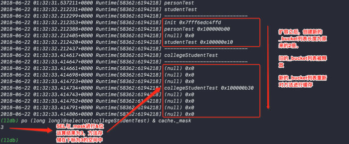 可以看出上图中_bucket散列表扩容之后仅仅存储了colleaeStudentTest方法,并且上图中打印SEL & _mask 位运算得出下标的值确实是_bucket列表中colleaeStudentTest方法存储的位置。
